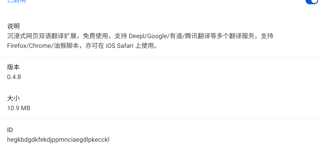 但这时候突然想起来,linux系统的配置应该都是有文件的,而输入法这种更可能有一个配置文件,于是想到了拓展程序唯一的那个id(一开始是想着搜rime这种关键词的,但毫无所获,尤其是不少分区不能修改),以沉浸式翻译为例